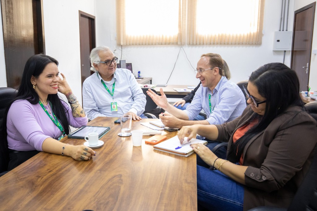 A foto mostra os participantes durante a reunião no gabinete do secretário de Agricultura, Vicente Falcão. Todos estão acomodados em volta de uma mesa de reunião.