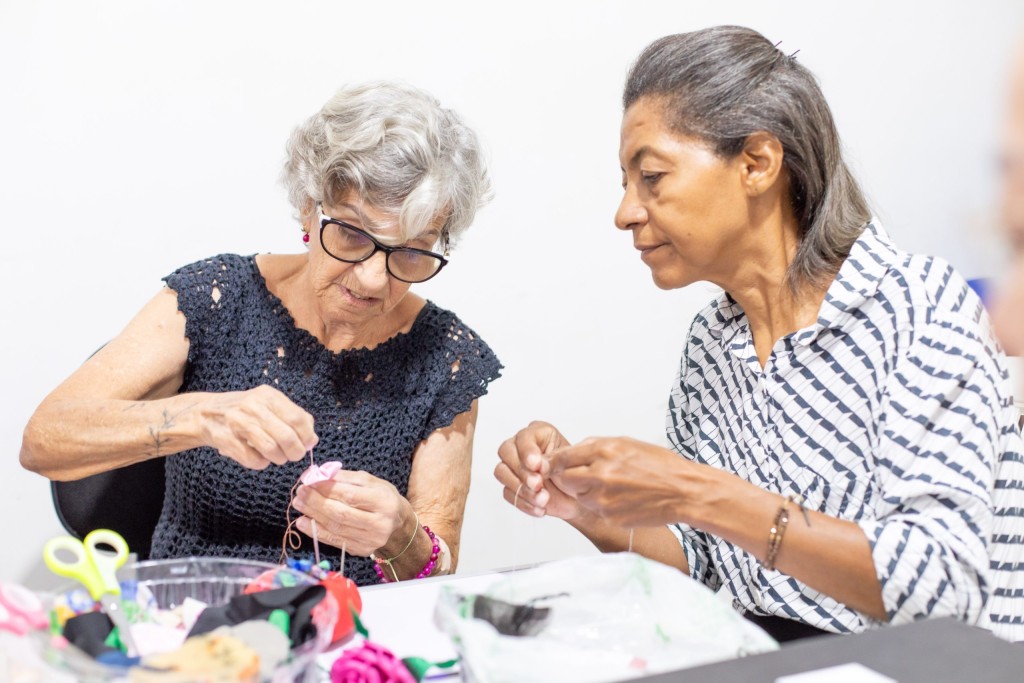 Na imagem, aparecem duas senhoras durante uma aula de arteterapia. O procedimento faz parte de um dos tratamentos oferecidos pela unidade citada no texto. A imagem apresenta várias cores, com fundo branco.
