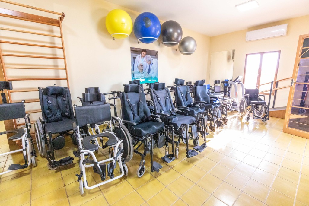 A imagem mostra diversas cadeiras de rodas, sendo a maioria na cor preta. Na foto, também é possível ver bolas grandes fixadas na parede acima das cadeiras, nas cores amarela, azul, preta e cinza.