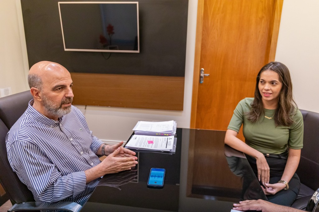 A foto ilustra o secretário Amauri Monge trajado de camisa social e apoiado numa mesa de cor preta. Sentado próximo à sua direita, está a professora Thatiany Soares Correa vestida com blusa social verde e calça jeans.