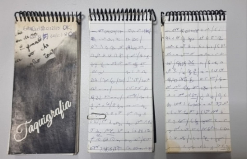 &nbsp &nbsp &nbsp &nbsp &nbsp &nbsp A respeito da década de 1980, não obtive informações sobre o serviço de taquigrafia na Câmara. Já na década seguinte, no ano de 1995, foi realizado um concurso para ingresso de cinco servidores para o cargo de taquígrafo. Duas dessas aprovadas concederam entrevista à coluna: Fabiana Orlandi e Cristiane Aparecida da Silva. A servidora Fabiana Orlandi ingressou na Câmara antes mesmo do concurso, em março de 1990, como estagiária da Escola Técnica Federal, com a tarefa de registrar as sessões ordinárias e as sessões que discutiam a Lei Orgânica do Município. Diz que os taquígrafos anteriores haviam migrado para outros órgãos e coube a ela e a três colegas realizarem a tarefa dos taquígrafos sem qualquer supervisão. Já Cristiane Aparecida da Silva ingressou no cargo de taquígrafa em 15 de setembro de 1997, após a aprovação no concurso. Como aluna do curso de Secretariado na Escola Técnica Federal, ela cursou a disciplina de Estenografia e utilizou esses conhecimentos por 24 anos, até 2021. Cristiane guarda suas cardenetas com a inscrição de letras e símbolos que, após as sessões, traduzia e transcrevia nos livros-ata (foto). Ambas utilizavam o método desenvolvido por Oscar Leite Alves, ensinado na Escola Técnica Federal, que consiste, de acordo com Fabiana, em registrar as palavras por símbolos derivados de um círculo. Para a aprovação em estenografia e para o concurso de 1995, elas precisaram demonstrar que conseguiam registrar pelo menos 60 palavras por minuto, fazendo uso de concentração e velocidade.&nbsp&nbsp